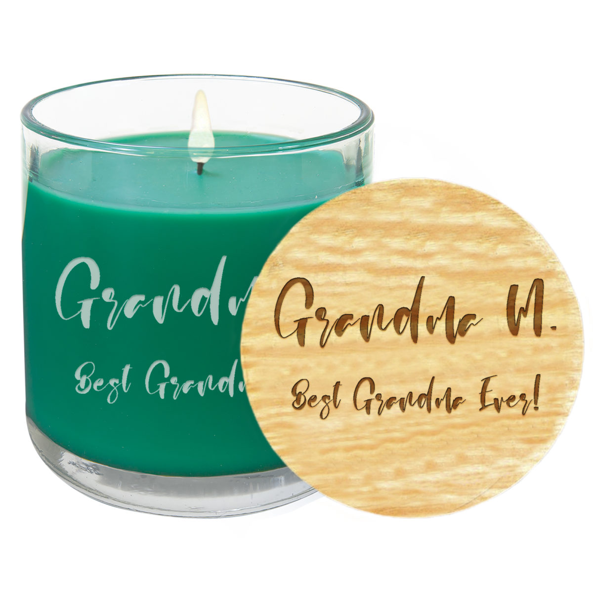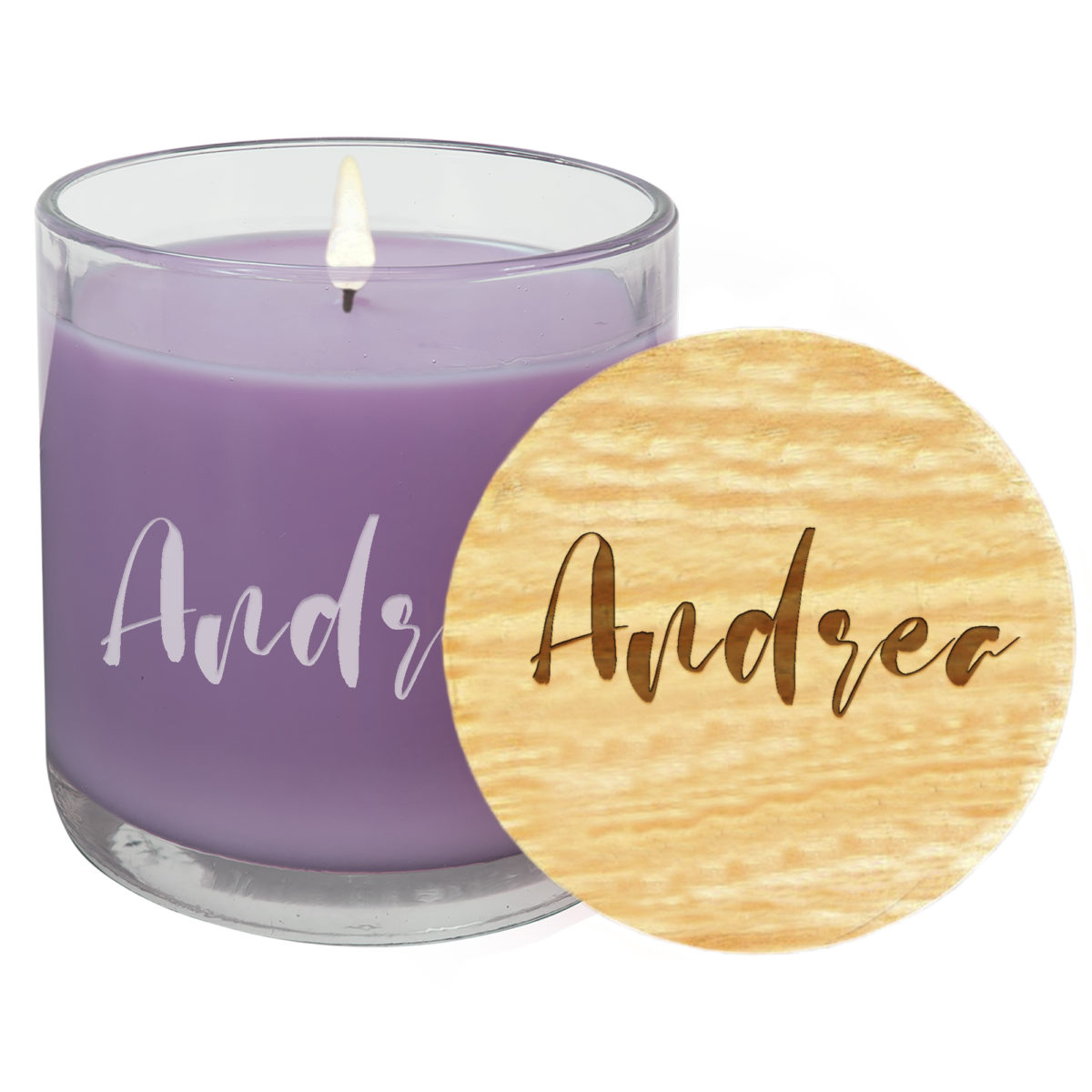 14 oz scented candle in a glass jar with wood lid. add a personalized laser engraving to the jar and lid with your own laser-engraved custom logo, design, or text to create a true one-of-a-kind gift. Makes the perfect promotional product or gift for weddings, housewarmings, anniversaries, Christmas, Mothers Day, etc… The wax is made of a soy blend that burns cleanly and consistently. Wicks are 100% cotton, contain no lead or chemicals, and produce minimal soot
