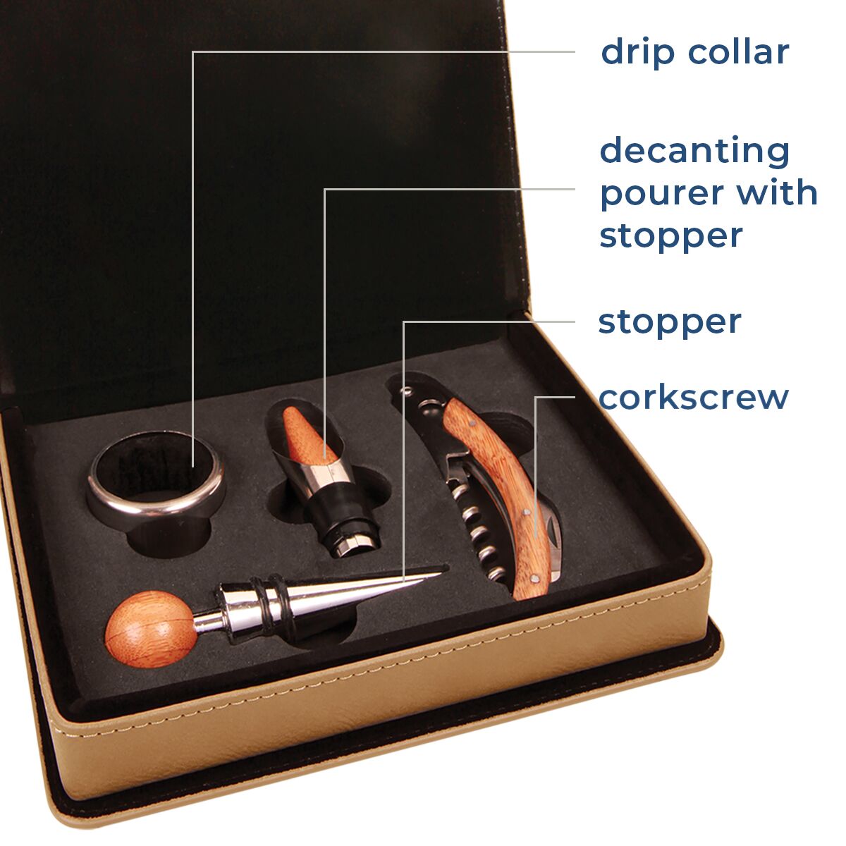 - Set includes Corkscrew, Wine stopper, Decanting Pourer w/ stopper & Drip Collar