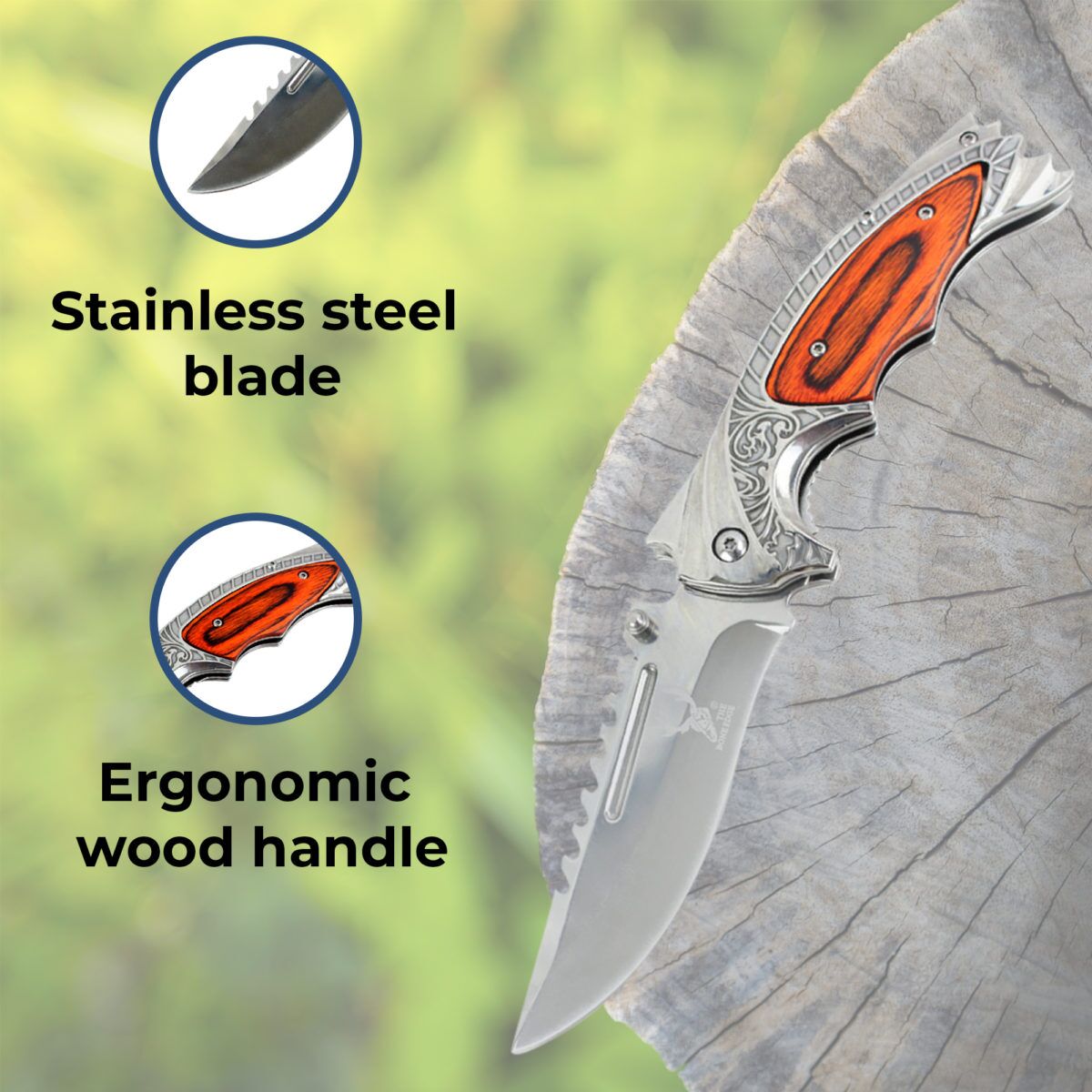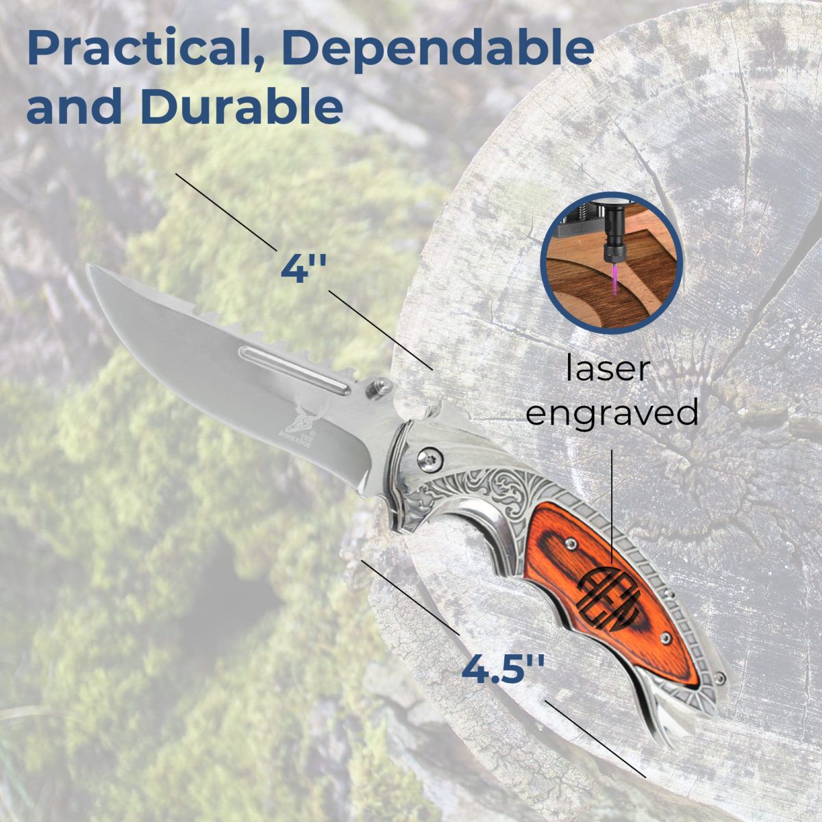 The perfect gift for any man and any occasion. Groomsmen or best man, father’s day, anniversary, or graduation, this elegant and useful folding pocket knife is a great gift. Add a custom-made engraving with a personalized message or monogram. This fine knife can be used as a keepsake or used as a daily tool, as it’s built out of stainless steel with a fine wood inlay in the handle to provide better grip and where the custom-made engraving goes. It’s a foldable knife with a belt clip that allows for maximum security and portability, its spring-assisted system provides ease of access.