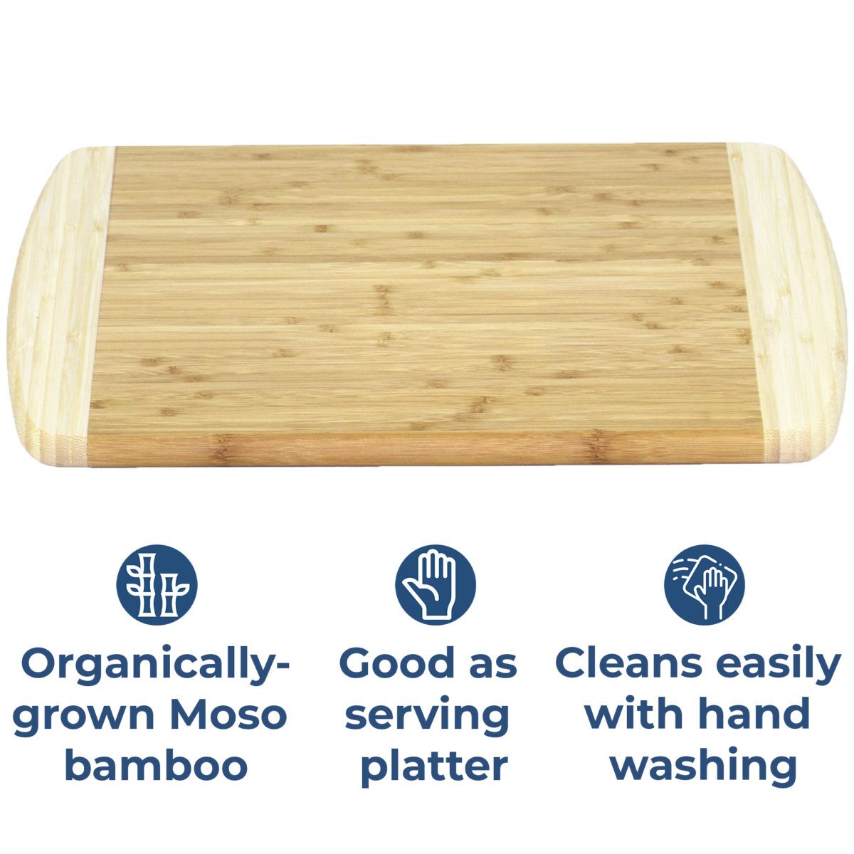 The perfect addition to any kitchen. Beautifully crafted from organically-grown Moso bamboo, the board features caps of natural light bamboo flanking the main cutting surface of rich caramelized bamboo. Bamboo is an excellent cutting surface: it’s lightweight yet durable and gentle on knives. Perfectly sized for everyday use at 14.5 x 11.5 in. It provides plenty of space for food prep and serving while still being easy to store. When the food prep is done, the cleans easily with hand washing; do not soak or wash in the dishwasher.