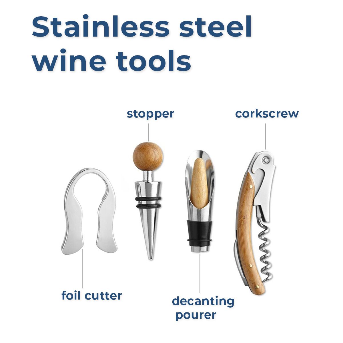 - Includes: Corkscrew, Stopper, Foil Cutter, & Decanting Pourer