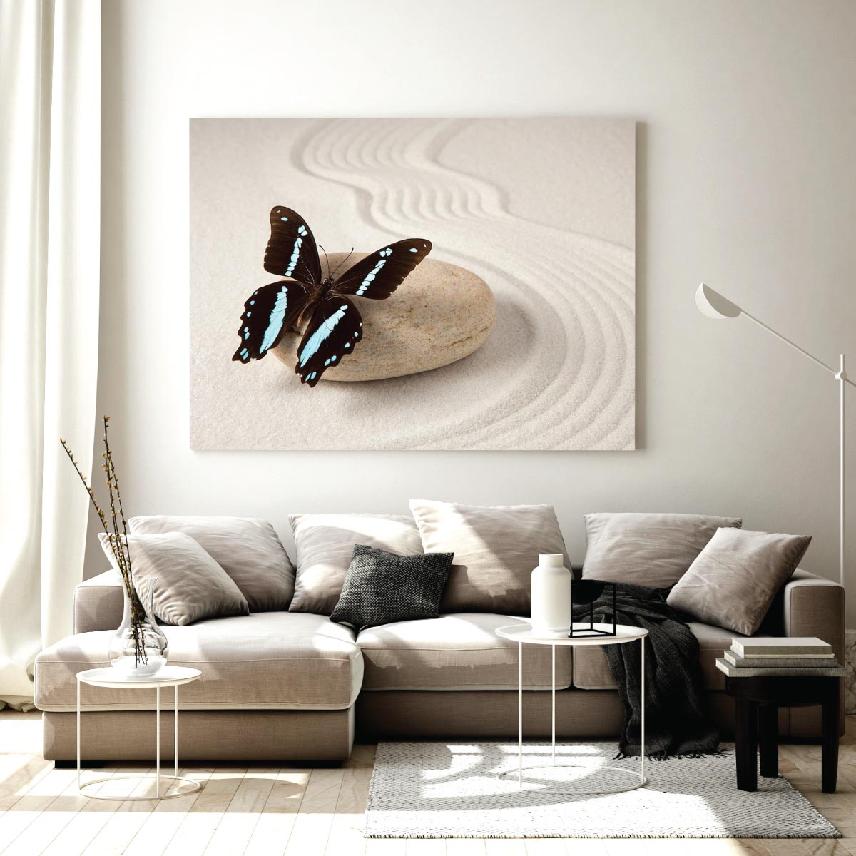 Transform any space with this beautiful acrylic print of butterfly with a zen art sand pattern background